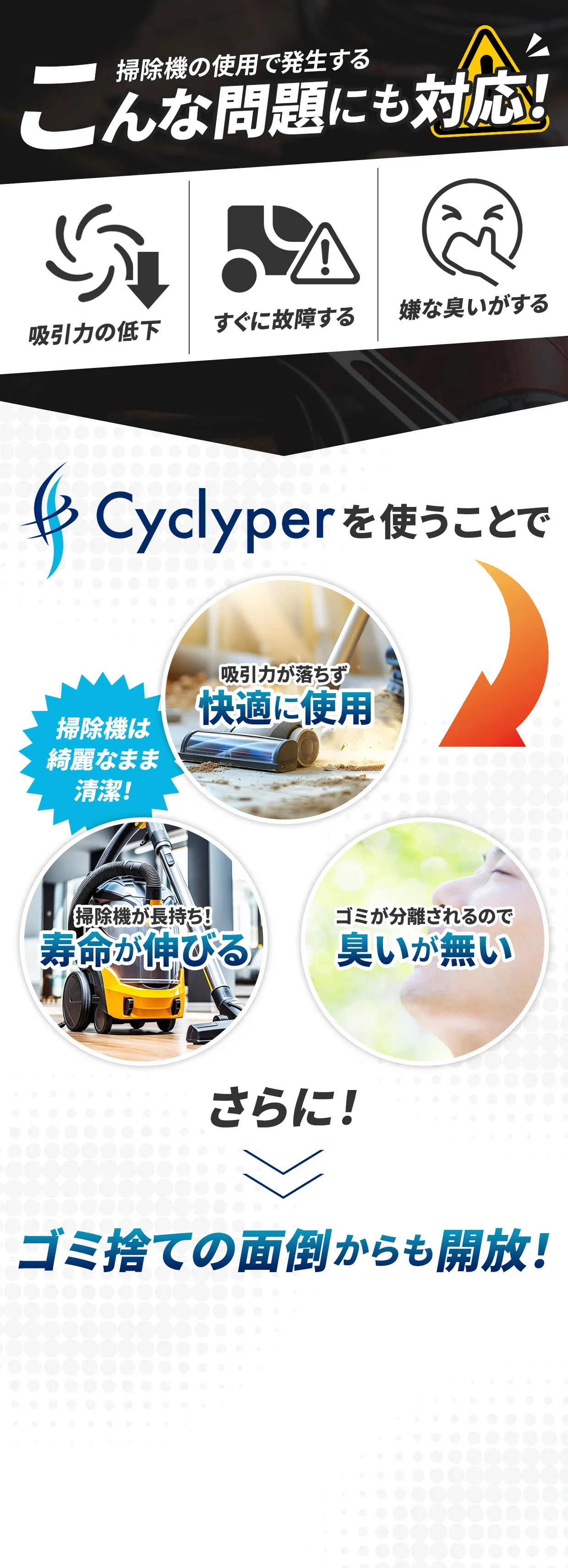 これは特に粉塵を吸引する場合、吸引力が弱いと十分な遠心力が生まれずに分離性能が落ちてしまうためです。 -